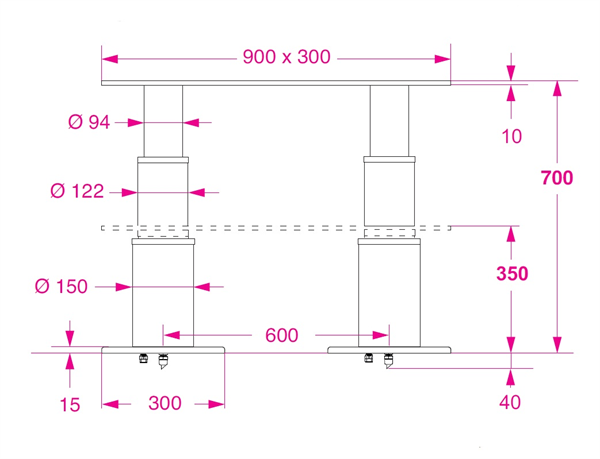 Senkronize ve mekanik olarak birbirine bağlı iki ayak, daha büyük masalarla kullanım imkânı sağlar. Boru ve tabanların geniş ölçüleri sayesinde büyük ebatlı masalar için uygundur. İki kademeli teleskopik yapı, masa–yatağa dönüşüm için sıklıkla gerekli olan düşük minimum yüksekliğin elde edilmesini sağlar. Talep üzerine 12V–8A veya 24V–4A (x2) güç beslemesiyle çalışır. Elektrikli hareket istenilen herhangi bir konumda durdurulabilir. Zeminden yalnızca güç besleme kabloları ve (dış mekânda kullanıldığında) 12 mm çapında su tahliye hortumları geçirilir.