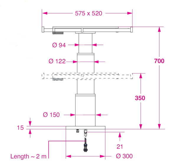 Boru ve tabanların ölçüleri sayesinde orta ebatlı masalar için idealdir. Ekstra uzantıları ile tablayı destekler. İki kademeli teleskopik yapı, masa–yatağa dönüşüm için sıklıkla gerekli olan düşük minimum yüksekliğin elde edilmesini sağlar. Talep üzerine 12V–8A veya 24V–4A güç beslemesiyle çalışır. Elektrikli hareket istenilen herhangi bir konumda durdurulabilir. Zeminden yalnızca güç besleme kablosu ve (dış mekânda kullanıldığında) su tahliye hortumu geçirilir. 3 konumlu anahtar ile çalıştırılır (dahil değildir): Yukarı – Aşağı – otomatik sıfıra dönüş. Anahtarın polariteyi ters çevirmesine gerek yoktur; elektrik akımı anahtar üzerinden geçmez. Ağırlık: 19.3 Kg.