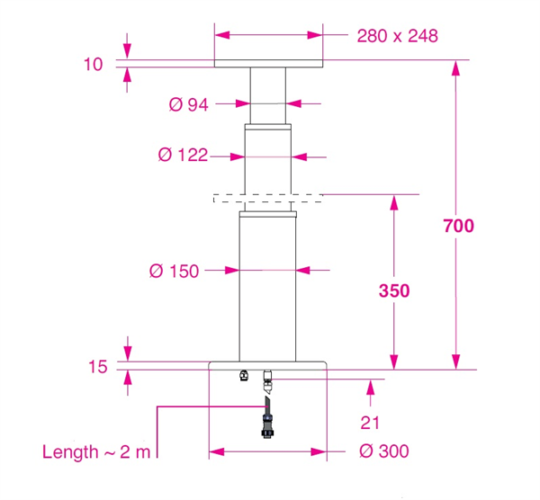 Boru ve tabanların geniş ölçüleri sayesinde büyük ebatlı masalar için idealdir. İki kademeli teleskopik yapı, masa–yatağa dönüşüm için sıklıkla gerekli olan düşük minimum yüksekliğin elde edilmesini sağlar. Talep üzerine 12V–8A veya 24V–4A güç beslemesiyle çalışır. Elektrikli hareket istenilen herhangi bir konumda durdurulabilir. Zeminden yalnızca güç besleme kablosu ve (dış mekânda kullanıldığında) su tahliye hortumu geçirilir. 3 konumlu anahtar ile çalıştırılır (dahil değildir): Yukarı – Aşağı – otomatik sıfıra dönüş. Anahtarın polariteyi ters çevirmesine gerek yoktur; elektrik akımı anahtar üzerinden geçmez. Ağırlık: 11 Kg.