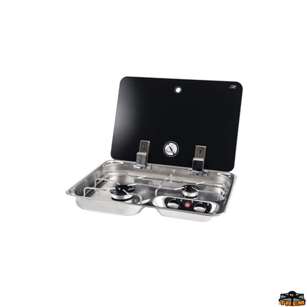 Paslanmaz çelikten yapılmış dikdörtgen gömme ocak, 2 brülor gaz kaynağı, titreşim önleyici rondelalarla sabitlenmiş paslanmaz çelik destek ızgarası mevcuttur. Gizli menteşeli temperli siyah cam kapak.