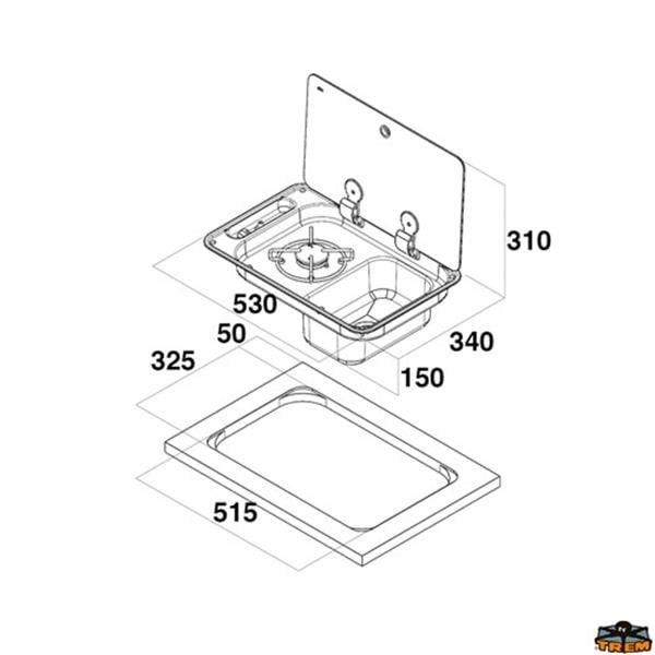 Paslanmaz çelikten yapılmış dikdörtgen gömme ocak, 1 brülörlü gaz beslemesi, sağda dikdörtgen lavabo ile donatılmış, titreşim önleyici rondelalarla sabitlenmiş paslanmaz çelik destek ızgarası. Gizli menteşeli temperli siyah cam kapak.