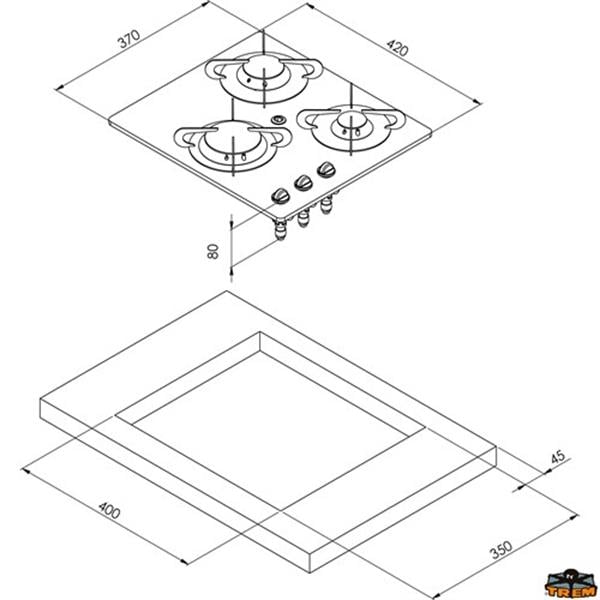 Çizilmeye karşı dayanıklı temperli camdan gömme dikdörtgen ocak, A-SR brülörlü 3 brülörlü gaz beslemesi. Ünitenin üst kısmında kolon tipi tencere tutucu için oturma yeri olarak kullanılan özel bir manşon bulunmaktadır.
