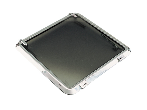 Gri akrilik cam. İçeriden ve/veya dışarıdan açılabilir. 180° açılabilme imkanı, 32 mm yükseklik. Tüm çerçeve ve menteşeler 316 paslanmaz çeliktir. Görünmeyen yüzeylerin paslanmazlığını sağlamak amacıyla elektro polisaj yapılmıştır. Tüm ağır şartlara dayanıklı neopren contası vardır.