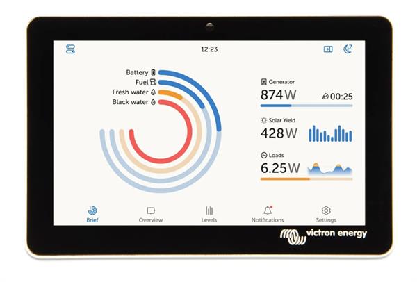 GX Touch 50 Cerbo GX ürünümüz için ekran aksesuarıdır. Beş inç dokunmatik ekran, sisteminize ilişkin genel görünüme anında ulaşmanızı ve ayarları göz açıp kapayıncaya kadar yapmanızı sağlar. Cerbo GX’e tek bir kablo ile basitçe bağlantı, süper ince su geçirmez tasarım, üste monte edilebilir kurulum ve basit montaj süreci düzenli ve temiz bir pano oluştururken fazlasıyla esneklik sağlar.